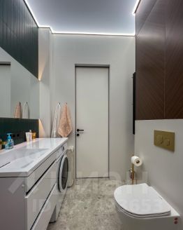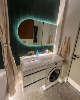 Ванная, раковина, подвесной унитаз, полотенцесушитель, стиральная машина.