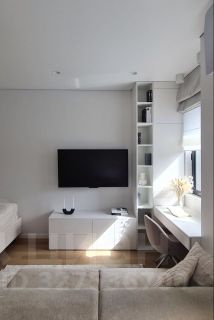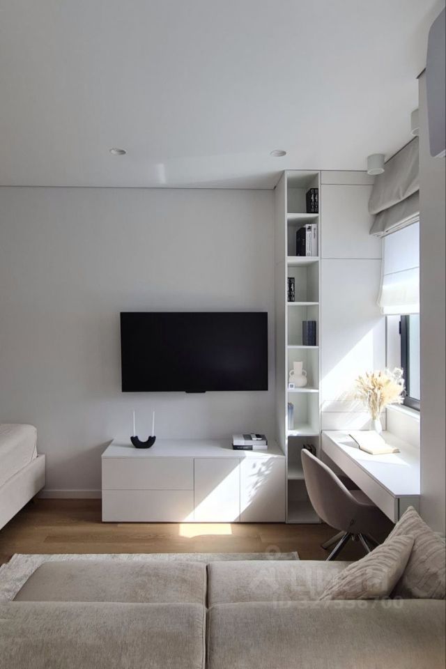 гостиная - рабочий стол, диван, телевизор, комод, встроенный книжный шкаф;