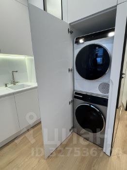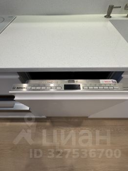 кухня- столовая- встроенный кухонный гарнитур с бытовой техникой ( варочная панель, свч+ духовка Bosch, посудомоечная машина Bosch, вытяжка, измельчитель пищевых отходов, фильтр для питьевой воды, стиральная машина Bosch, сушильная машина Bosch) , каменная столешница на кухне , обеденный стол изготовлен индивидуально ;