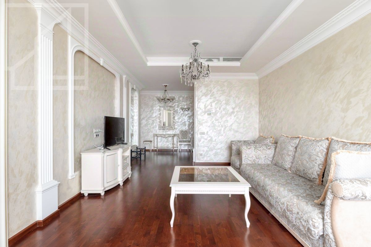 Планировка: просторная гостиная, кухня с обеденной зоной, две спальни, жилая комната (можно использовать как спальню или кабинет), два совмещенных санузла с ванной и душевой кабиной, гардеробная, прихожая. Квартира меблирована, укомплектована необходимой бытовой техникой.