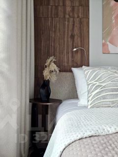 Спальня для идеального сна: Кровать Askona с обивкой из шенилла и анатомическим матрасом (модель Family mild). Полная темнота в любое время суток обеспечена жалюзи и шторами Blackout.