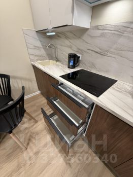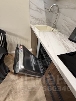 На кухне установлена мебель и техника, холодильник, стиральная и посудомоечная машина встроенны в кухонный гарнитур , микроволновая печь, чайник имеются.