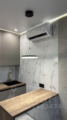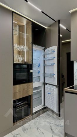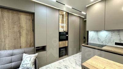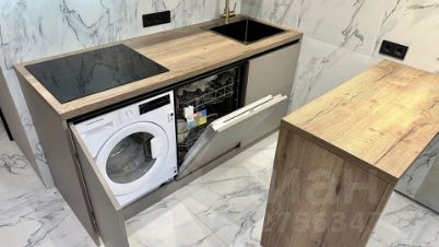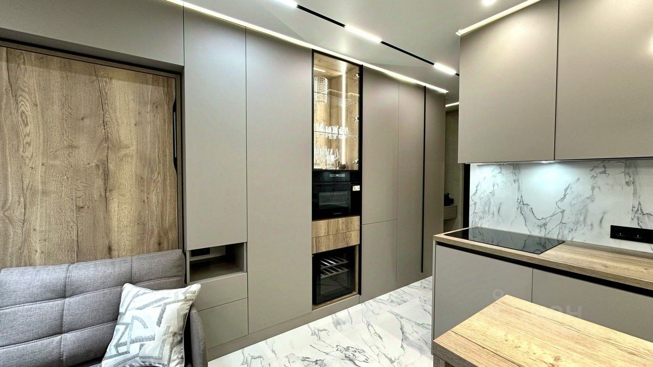 Кухня оснащена современной бытовой техникой: индукционная плита, мощная вытяжка, холодильник, винный холодильник, духовой шкаф с функцией пара, посудомоечная машина (работает с Алисой), стиральная машина с функцией сушки и кондиционер. Есть подогрев пола. Свет в студии также работает с Алисой.