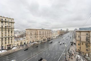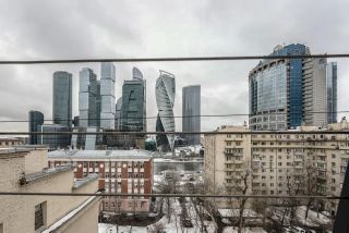 Окна выходят на две стороны: во двор и на Кутузовский проспект. С балкона в гостиной открывается вид на Новый Арбат, из кухни и кабинета — на набережную Москвы-реки и на Сити.