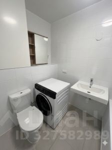 • Санузел: Совмещенный, в аккуратной белой плитке. Установлена стиральная машина, современная сантехника и шкафчик с зеркалом.