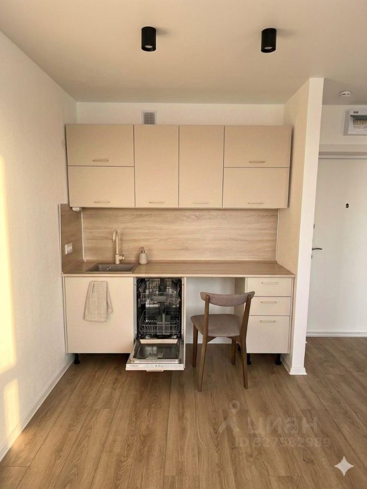 • Кухня и рабочая зона: Компактный и стильный кухонный гарнитур, встроенная посудомоечная машина, раковина. Предусмотрено удобное рабочее место со стулом.