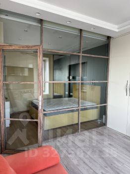 кухнягостиная + спальня, отделённая стеклянной перегородкой с роликовыми шторами блэкаут (можно полностью изолировать пространство);