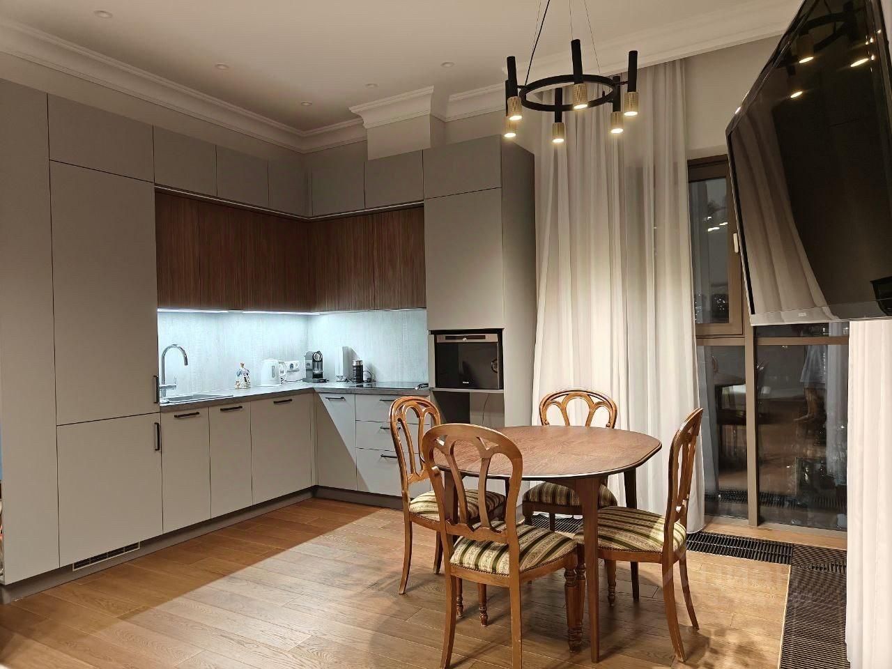 В квартире выполнен евроремонт в современном стиле. Просторная кухня-гостиная оборудована всей необходимой техникой Bosch. В апартаментах две просторные лоджии, плюс выделенный отсек для кондиционера. Мастер-спальня со своим санузлом. В одном санузле ванная, в другом - душевая кабина. Имеются две гардеробные (ниши).