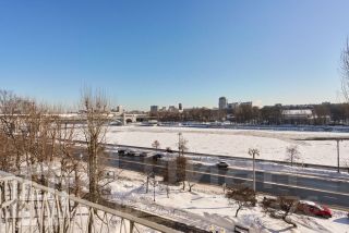 Спальня и просторный зал с панорамными окнами выходят на набережную и Москву-реку — наслаждайтесь утренним кофе с видом на воду.