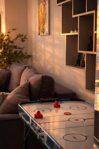 Из панорамных окон открывается впечатляющий вид на город и вечернюю Москву, а уникальной особенностью апартамента является настоящий игровой аэрохоккей — единственный в Москва-Сити.