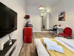 Номер уютно обставлен и оснащён необходимым, чтобы отдохнуть после долгого и насыщенного дня. Имеются телевизор. Перечисленные услуги есть не во всех номерах.