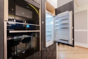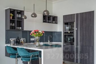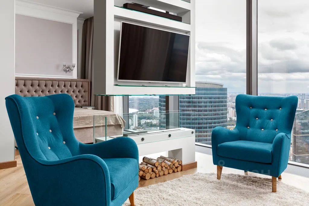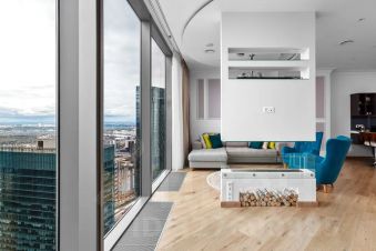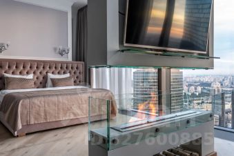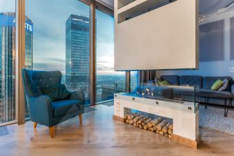 И, конечно, безусловной фишкой этого апартамента выступает биокамин, разделяющий зону гостиной и спальни на 2 части единого пространства, а 5 панорамных окон окутают вас потрясающим видом на западную часть Москвы, особенно на закатах.