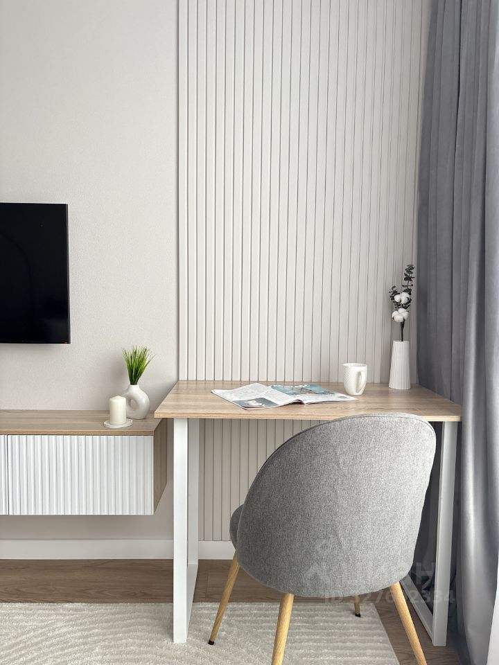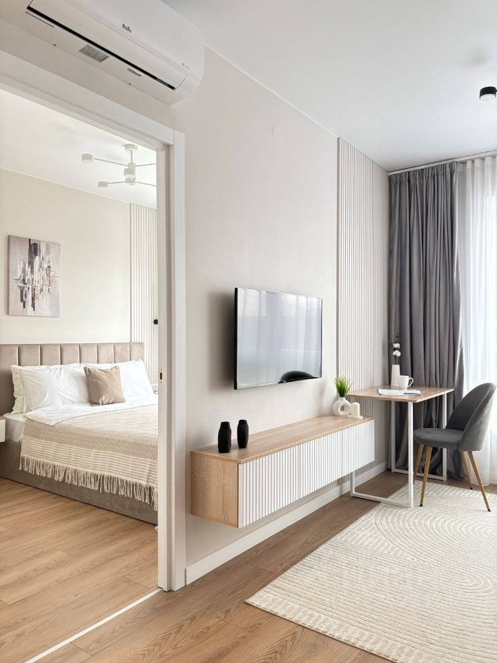 В гостиной удобный раскладной диван и полноценное рабочее место.