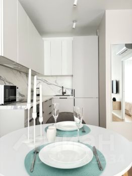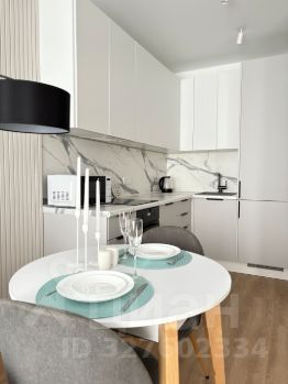 Стильная кухня, включающая большое количество мест хранения, оборудована всей необходимой техникой и посудой, раскладной стол для приема гостей.