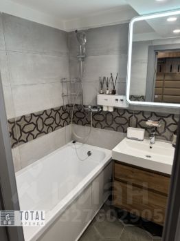 Санузел с ванной, зеркалом с подсветкой и удобными местами для хранения.
