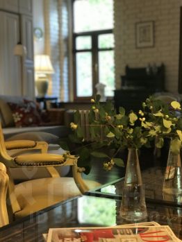 Антикварный стол и французские кожаные кресла, необыкновенная итальянская люстра ручной работы, антикварные светильники.