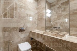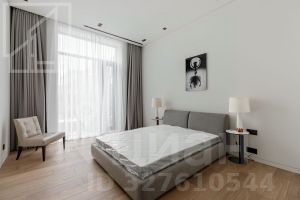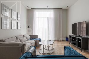 Планировка: гостиная с зоной кухни, две спальни с собственными ванными и гардеробными, гостевой санузел. Апартамент оформлен в стиле современной классики, имеется вся необходимая качественная бытовая техника. Окна выходят на обе стороны.