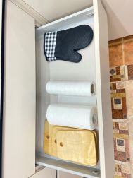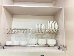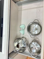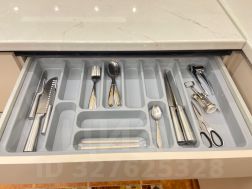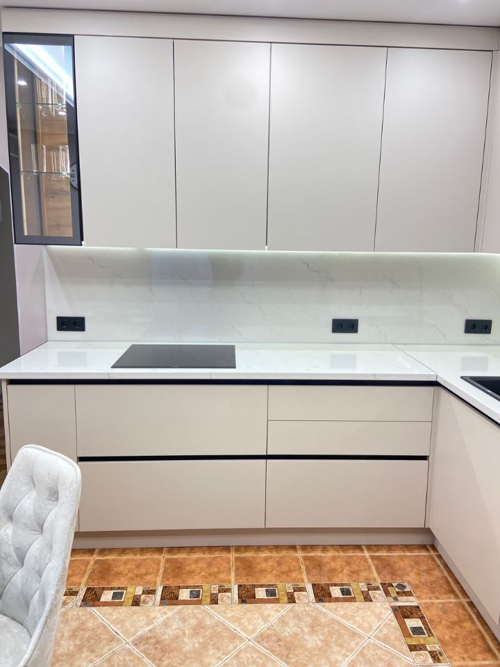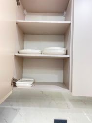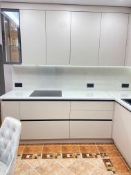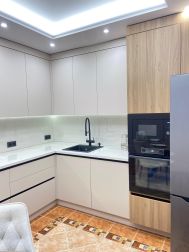 На кухне новый современный гарнитур, новая бытовая техника: встроенная посудомоечная машина, встроенная микроволновая печь, духовой шкаф, а также необходимая посуда: столовый сервиз на 6 персон,кастрюли, сковорода, чайник, столовые приборы. Кухня объединена с лоджией, что добавляет дополнительное пространство.