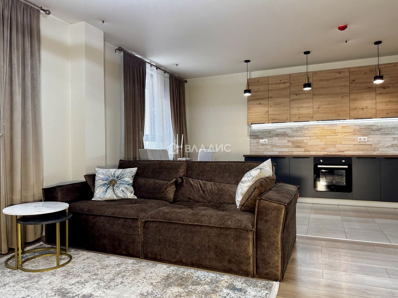 Просторная гостиная-кухня и 2 окна во двор, полностью меблированная и оснащенная бытовой техникой кухня, большой обеденный стол у окна, ТВ-зона с диваном. Прихожая с большой гардеробной.