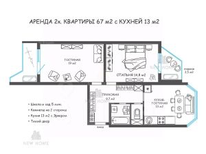 АРЕНДА 2к КВАРТИРЫ 67 м2 с КУХНЕЙ 13 м2