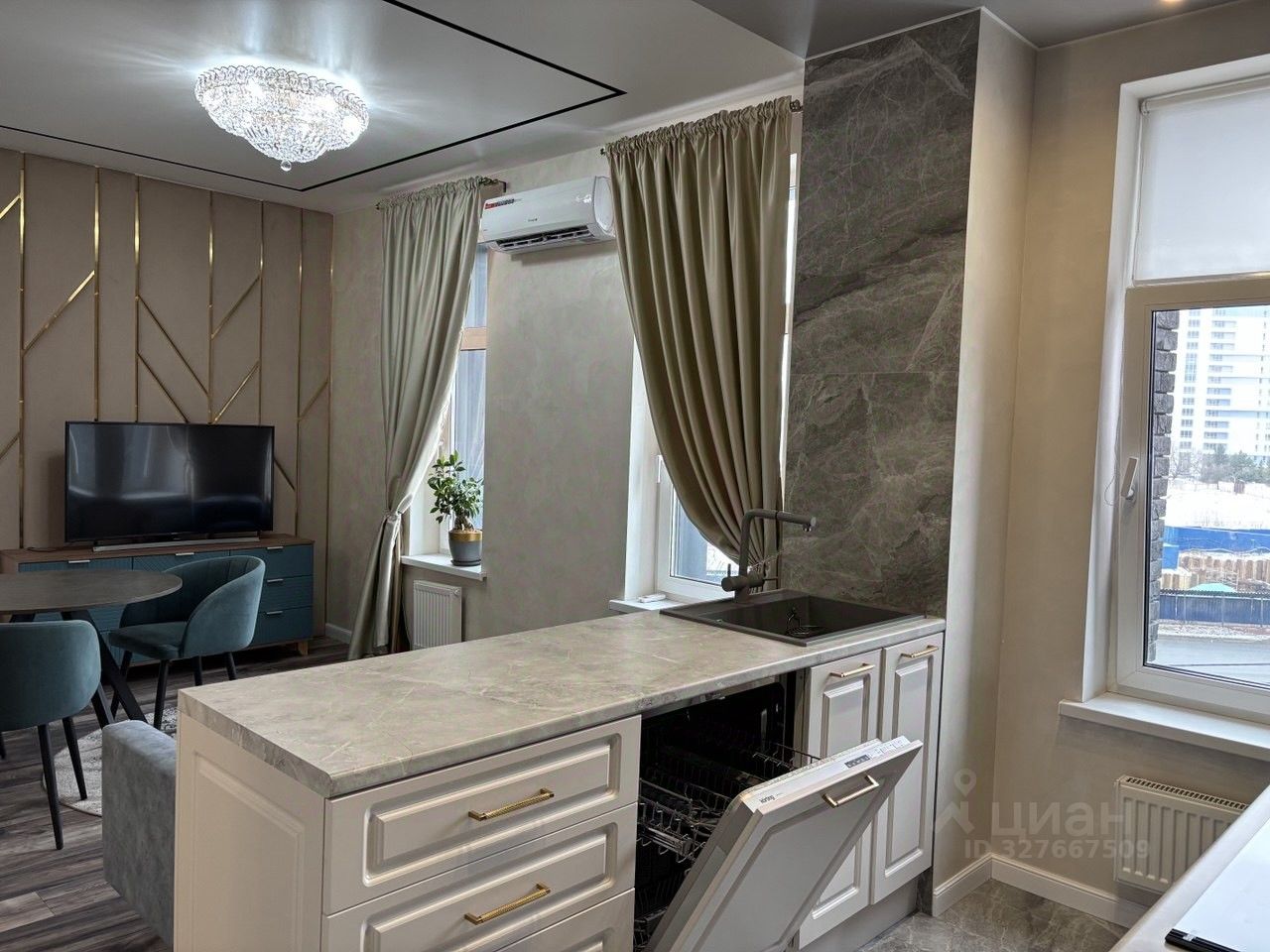 - Состояние: дизайнерский ремонт, новая мебель и техника Кухнягостиная укомплектована всем необходимым: холодильник с морозильной камерой, посудомоечная машина, духовой шкаф, СВЧ, стиральная, сушильная машины. Также есть диван, телевизор, кресла, обеденный стол, кондиционер.
