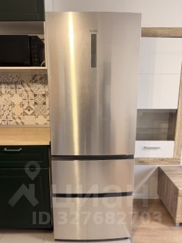 Кухня-гостиная: кухня IKEA с столешницей, фартук. Варочная поверхность и духовка с грилем - индукционная Gorenje (быстрый нагрев и безопасность). Большой отдельностоящий холодильник Haier с зоной свежести (Fresh Zone) сохранит продукты надолго. Есть стильный обеденный стол со стульями.