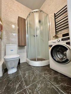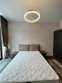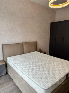 2 французских окна, большая гардеробная, стильный санузел, кухня со всей бытовой техникой, большая двуспальная кровать с подъемным механизмом для дополнительного хранения, трехстворчатый шкаф, комод, тумбы, телевизор Samsung, разные сценарии освещения, бархатные шторы блэкаут.