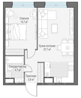 Планировка: одна изолированная спальня, просторная кухня-гостиная, совмещенный санузел.