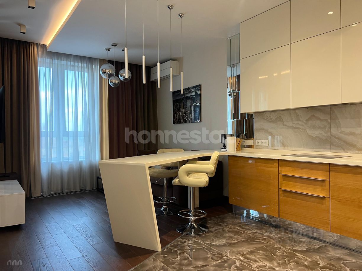 Предлагается в аренду стильная двухкомнатная квартира в современном жилом комплексе. Общая площадь — 50 кв. м, жилая — 28 кв. м, кухня — 16 кв. м. Квартира находится на 6 этаже 36-этажного дома, что обеспечивает прекрасный вид на город. Высокие потолки — 3,2 метра — добавляют ощущения простора и света.