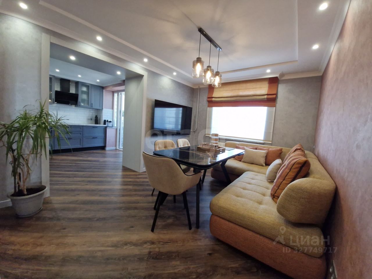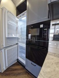 Кухня с полным набором встраиваемой техники совмещена с гостиной столовой группой: вместительный угловой диван, большой обеденный стол со стульями. Из кухонной зоны есть выход на меблированную лоджию. На кухне имеется вся необходимая утварь, набор столовой посуды и приборов для готовки. Чайник, тостер, кофемолка, кофеварка. Бакалы, стаканы, робот пылесос.
