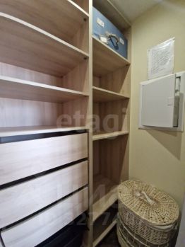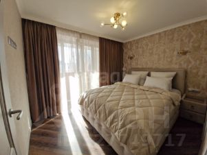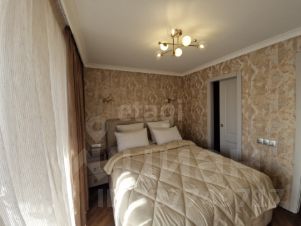 В квартире две спальни. В одной двуспальная кровать, две прикроватный тумбочки, два бра и небольшая гардеробная.