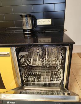 В кухонной зоне гарнитур со встроенной бытовой техникой западных производителей: посудомоечная машина Bosch, варочная панель и духовой шкаф Neff, вытяжка, холодильник Gorenje.