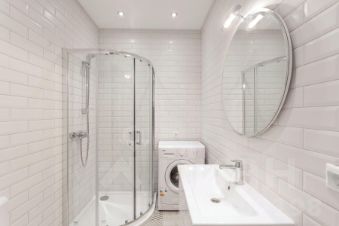 В квартире один совмещенный санузел с душевой кабиной, раковиной, зеркалом с подсветкой и стиральной машиной.