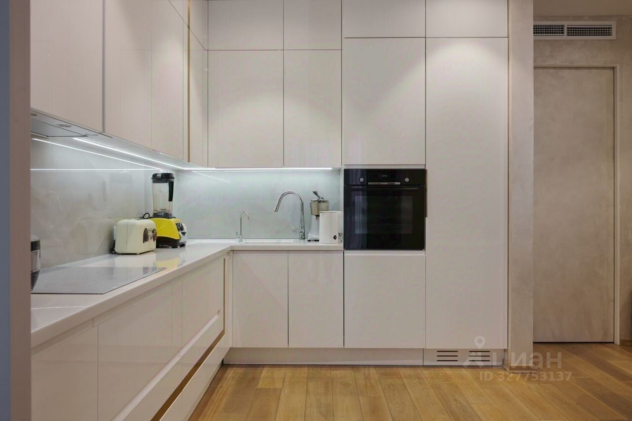 Современный дизайн-проект с высокой детализацией. Мебель на заказ по размерам квартиры. На полу — инженерная доска (натуральное дерево), в двух санузлах — теплые полы. Фасады шкафов выполнены из натуральных материалов.