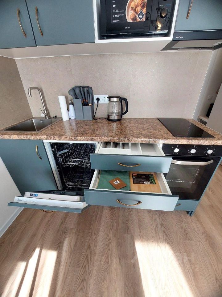Встроенная кухонная мебель, вся бытовая техника: посудомоечная машина, стиральная машина, кондиционер с дистанционным управлением, микроволновая печь, холодильник, варочная плита, духовой шкаф, электрический чайник, кухонная утварь, посуда. Диван раздвижной 155х200 в раскрытом виде, напольная сушилка, настенная сушилка, электрический полотенцесушитель, утюг, гладильная доска. Достаточно много мест для хранения личных вещей, совмещенный санузел, интернет.