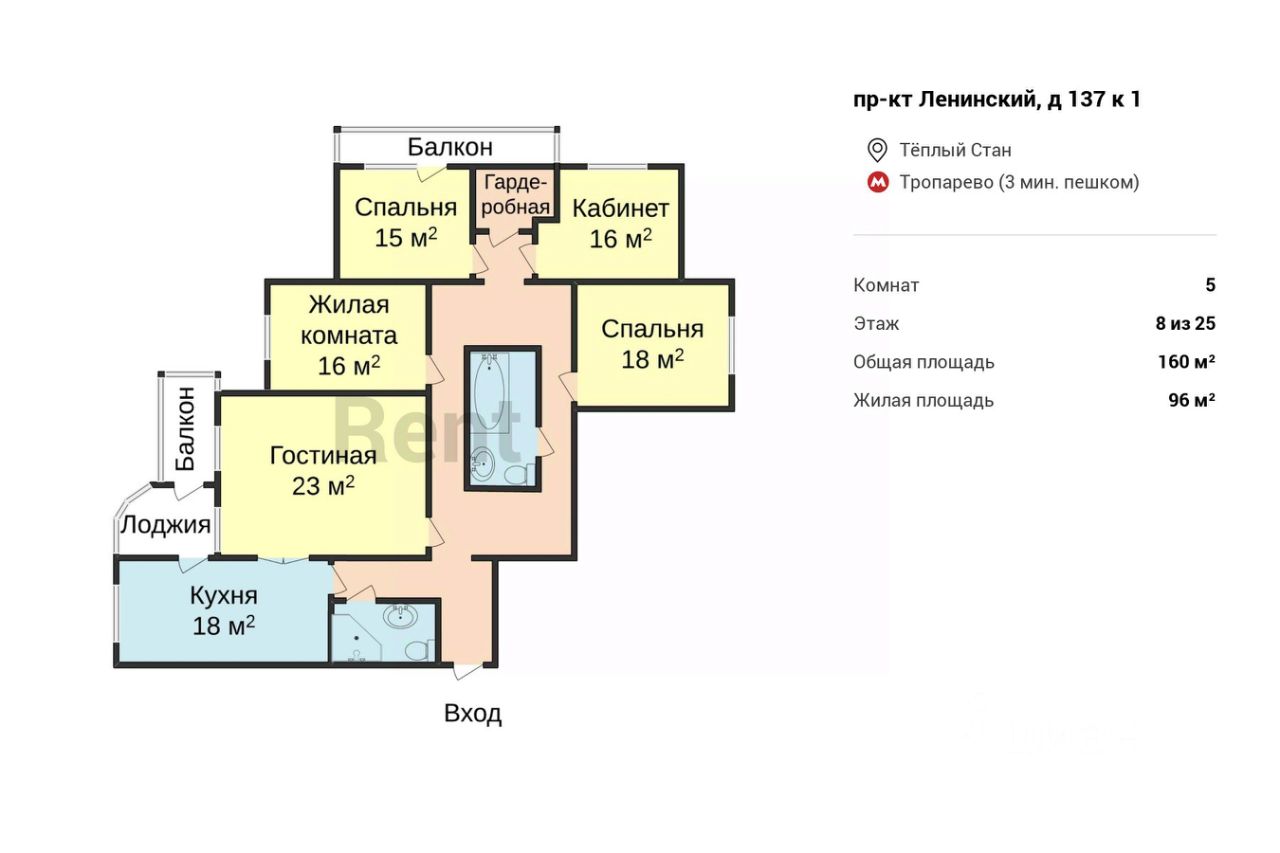 БЕЗ КОМИССИИ ДЛЯ АРЕНДАТОРА. Предлагается просторная пятикомнатная квартира у ландшафтного заказника Теплые Стан и метро "Тропарево". Гостиная, две изолированные спальни, кабинет и жилая комната располагают полным набором добротной мебели. Практичный кухонный гарнитур укомплектован нужной бытовой техникой, включая холодильник и микроволновую печь. Оборудовнаы две ванные комнаты и гардеробная. Установлен кондиционер.