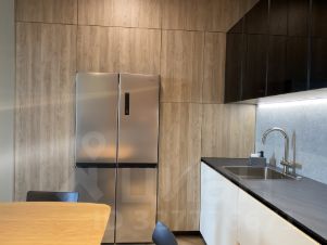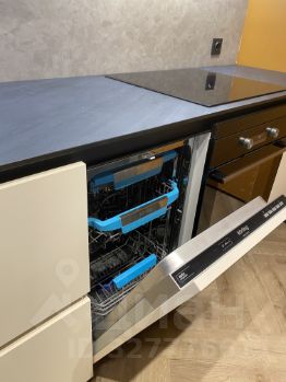 - обустроенная кухня-гостиная (кухонный гарнитур, холодильник, духовка, печь СВЧ, посудомоечная машина, чайник, стол и мягкие стулья, удобный диван, телевизор с тумбой)