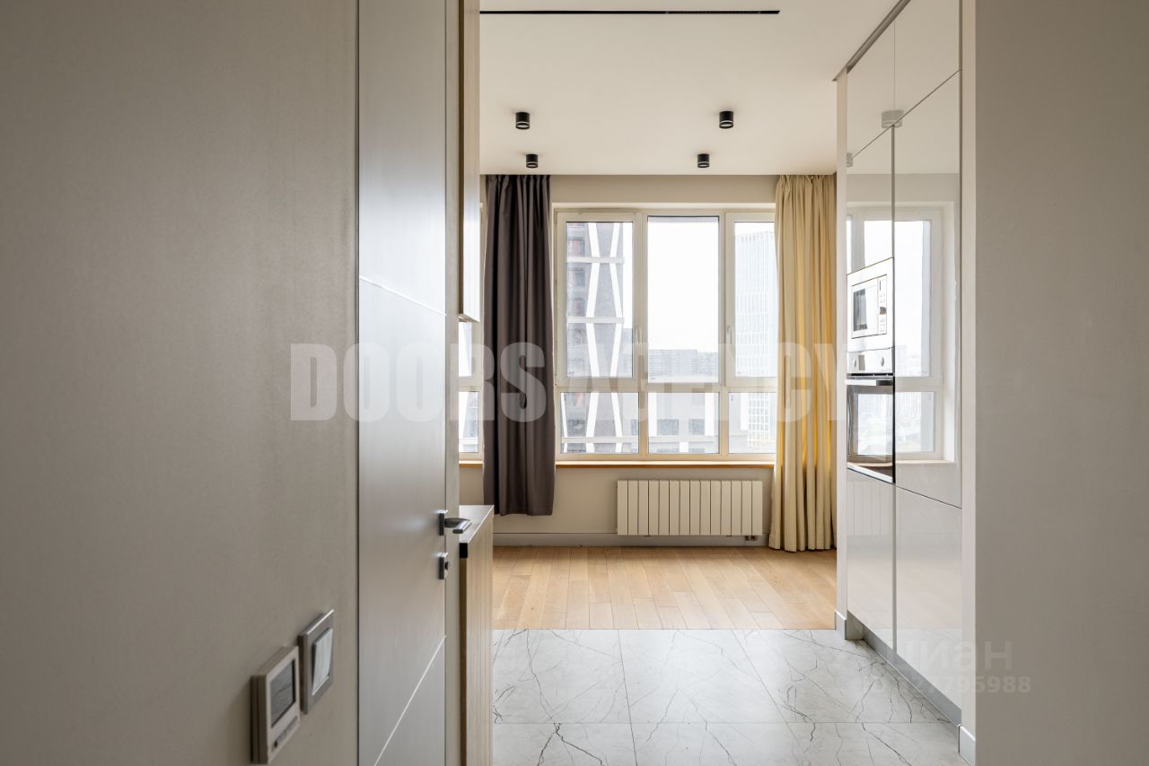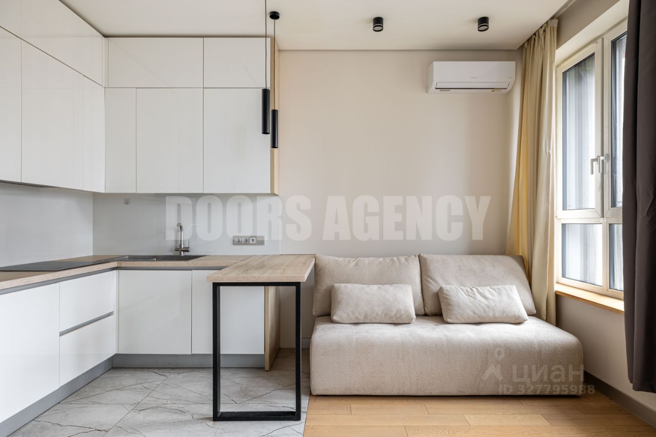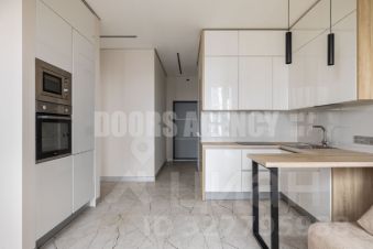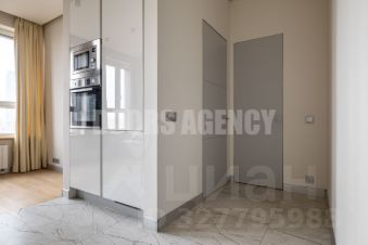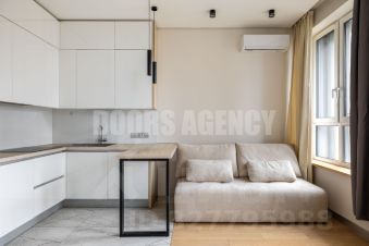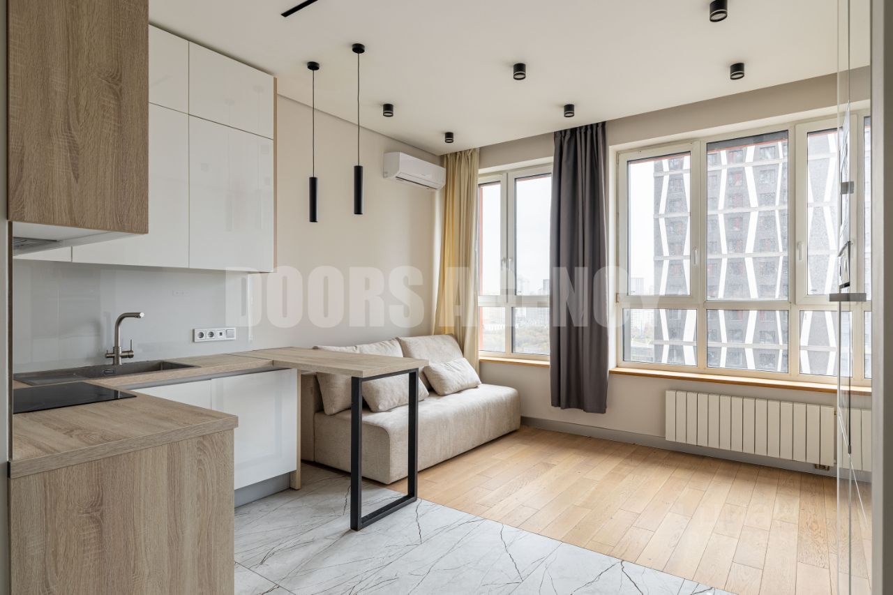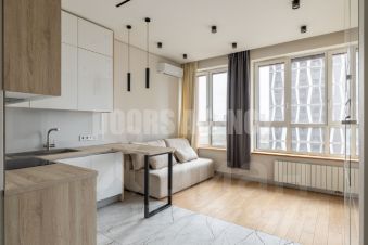 Планировка: кухня-гостиная, изолированная спальня, гардеробная, совмещенный санузел с душем. В квартире имеется вся необходимая техника: посудомоечная машина, стиральная машина, варочная панель, вытяжка, духовой шкаф, свч шкаф (микроволновка), холодильник. Установлен кондиционер и теплый пол в с/у. Высокие потолки (3.1 м). Окна на парк Событие и МГУ.