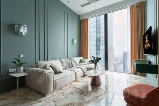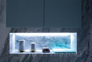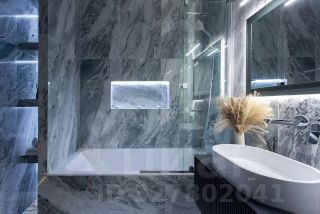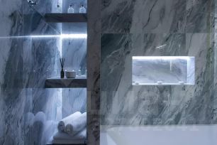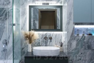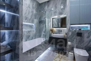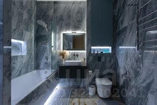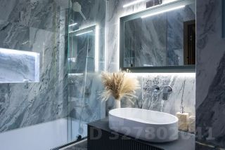 Санузел выполнен из натурального мрамора и оникса и напоминает интерьер дорогого пятизвёздочного отеля. Большая ванна, отдельная душевая зона, премиальная сантехника и художественная подсветка пола, стен и потолка создают атмосферу полного расслабления и роскоши.