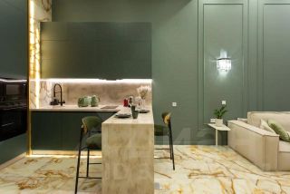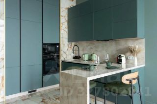 Современная кухня полностью оборудована для комфортного проживания и приёма гостей. Каменная барная стойка с эффектной подсветкой становится стильным центром пространства и отлично подходит для вечеринок или уютных вечеров.