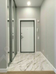 В прихожей огромный зеркальный встроенный шкаф для хранения вещей.