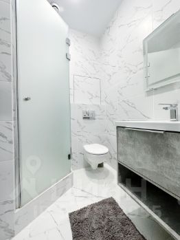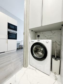 В ванной душевая кабина, стиральная машина, шкафы для хранения принадлежностей.