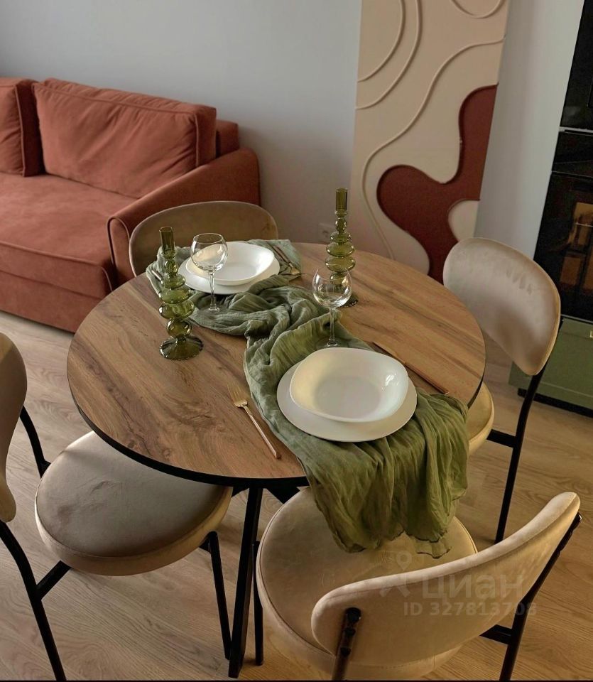 В гостиной имеется телевизор, стильный диван,а так же разные аксесуары для комфорта. Обеденная зона оборудована круглым столом и стульями. Кухня оснащена современной техникой: холодильник, плита, микроволновая печь, посудомоечная машина и стиральная машина.