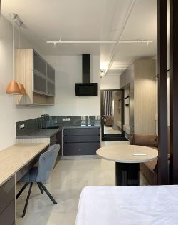 Чистая, светлая студия с балконом, выполнен качественный капитальный ремонт, установлена вся необходимая мебель, техника и оборудование, интернет, видео-домофон, кондиционер, теплые полы, водонагреватель, аккумуляторный пылесос. Много мест для хранения, гардеробная, комод, рабочий стол, обеденный стол, кровать с подъемным механизмом, большой диван, на кухне - большие ящики для хранения, СВЧ совмещенная с духовкой, встроенный полноразмерный холодильник и морозильник, варочная панель на 2 конфорки, вытяжка, посудомоечная машина, фильтр питьевой воды, в санузле - душевая зона, стиральная машина, шкаф для хранения уборочного инвентаря.
