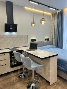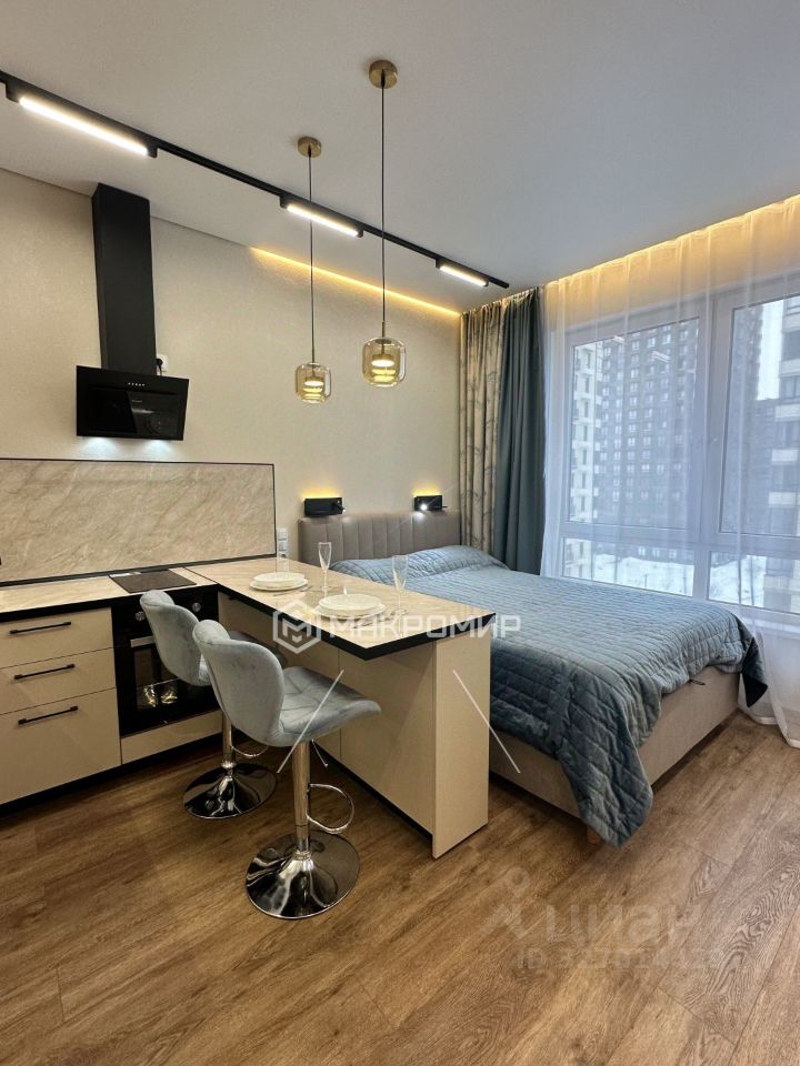 Дизайнерский, реально продуманный ремонт. При проектировании студии учитывались потребности в хорошем сне (кровать, звукоизоляция потолка), месте для досуга и гостей (диван и телевизор), работы, удобной трапезы (барная стойка), организации хранения большого количества вещей и при этом сохранения достаточно свободного места. Все получилось и здесь именно так.