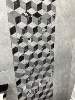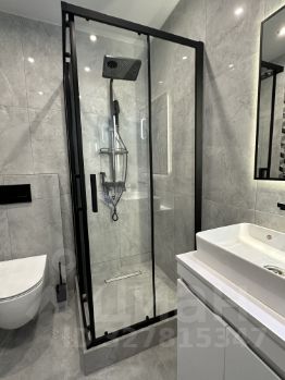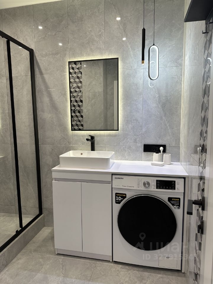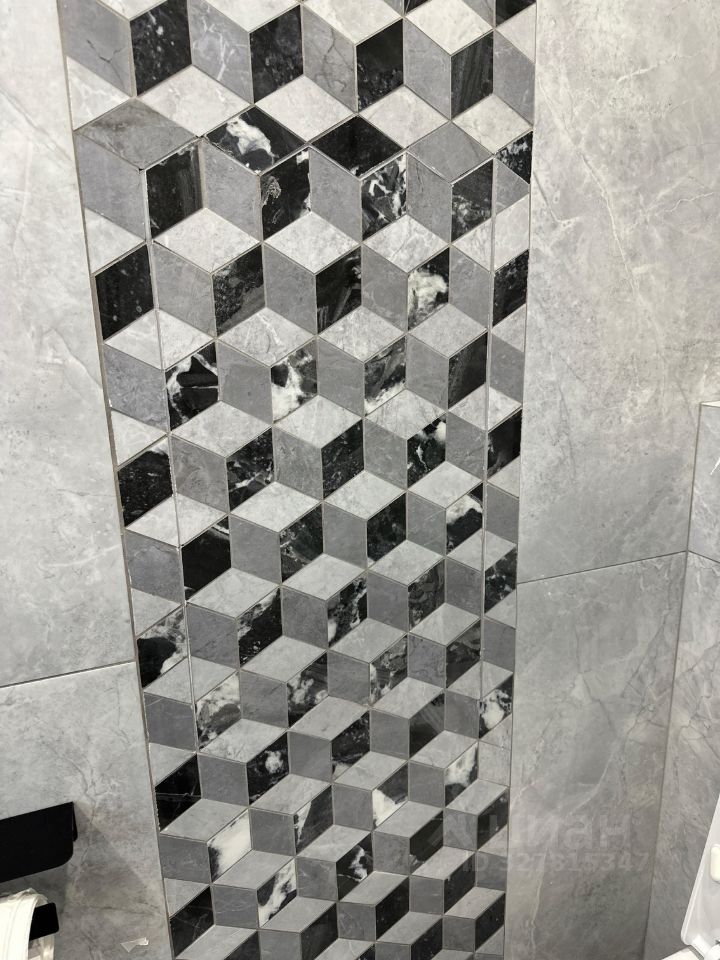 Ванная выполнена дизайнером в коллекции Keramo Maracci Rialto в светло серых тонах с 3D мозаикой. Есть стиральная машина, удобная душевая кабина и целая стена с подогревом для комфортной сушки ваших халатов и полотенец (кстати - полотенца мы тоже уже подготовили).