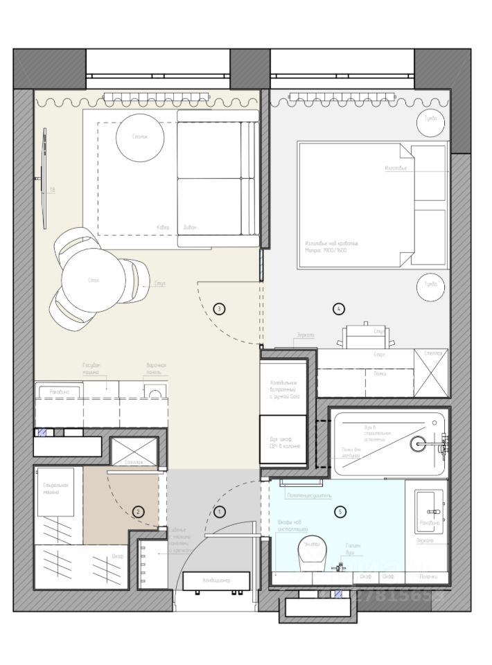 Продуманная планировка: кухня-гостиная, спальня, гардеробная, санузел, входная зона.