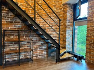 На нижнем этаже находится кухня- гостиная, на верхнем спальня и рабочая зона.