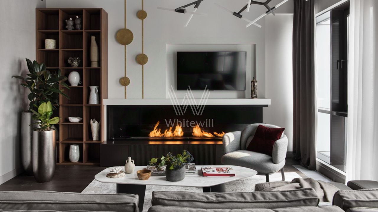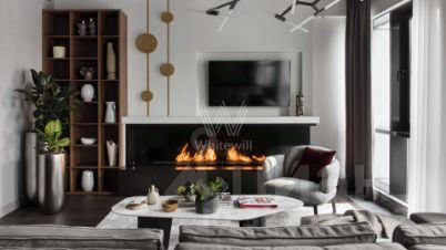 В гостиной мягкий свет камина и тёплое дерево на стенах встречаются с прохладой больших окон и металла. Это напоминает уют лофтов в Сохо, где за панорамами улиц всегда скрыт живой огонь и мягкие уютные кресла.