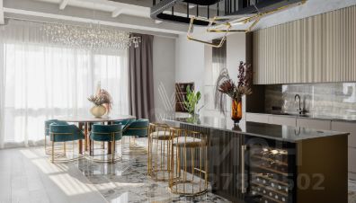 Кухня и гостиная балансируют на стыке делового и праздничного Нью-Йорка. Барные стулья с золотыми элементами, мраморный пол с ярким рисунком, современные светильники и композиции из сухоцветов будто готовят сцену к коктейльной вечеринке где-нибудь на Пятой авеню.
